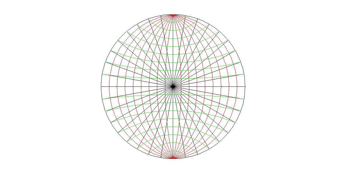 Falsilla ecuatorial con los paralelos representados en verde y los meridianos en rojo. Los centros de las circunferencias verdes están sobre la vertical que pasa por el centro mientras que los centros de las circunferencias rojas están sobre la horizontal que pasa por el centro.